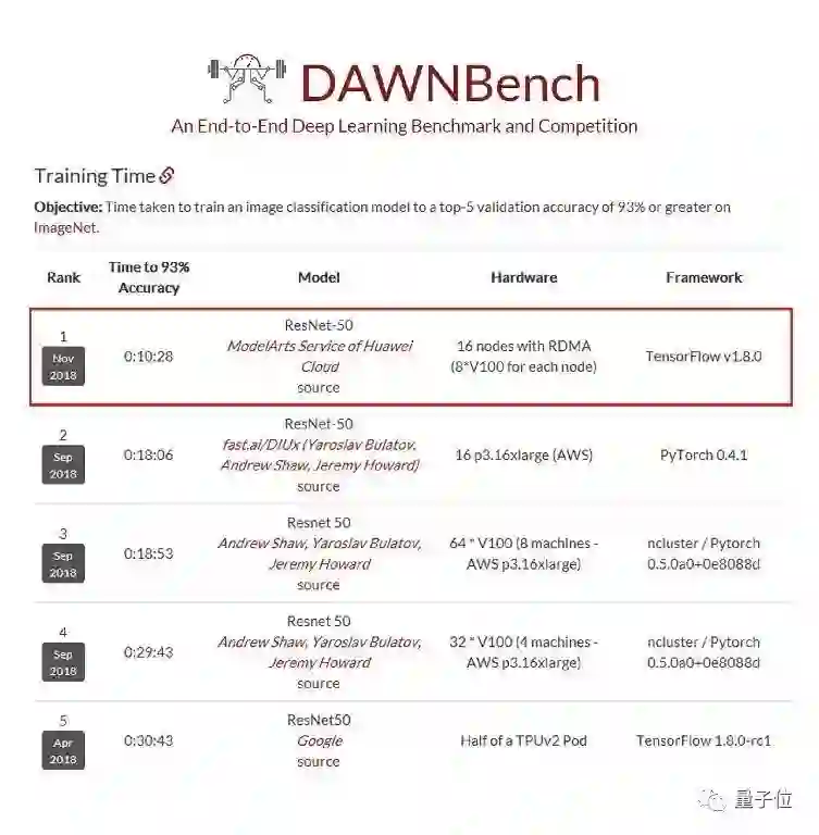 就在最新公布的DAWNBenchmark成绩排名中,在图像识别(ResNet50-on-ImageNet,93%以上精度)的总训练时间上,华为云ModelArts以10分28秒的成绩,比第二名提速近44%,拿下最新全球第一。