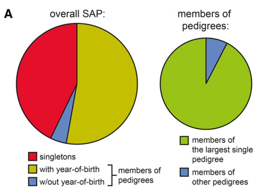 对某个性状的遗传力进行评估是一项十分困难的工作。从 5400 万份公共家族谱中,Ancestry 删除了众多没有关联的条目,并将剩余的谱系拼接在一起。在与 Graham Ruby的研究小组分享数据之前,Ancestry 从家谱中删除了所有可识别的信息,只留下出生年份,死亡年份,出生地(美国境内的州和美国以外的国家/地区)以及构成谱系结构本身的家族联系。他们最终获得了一个超过 4 亿人的谱系分析,通过检查亲属之间的寿命相似性来估计谱系的遗传性大小。