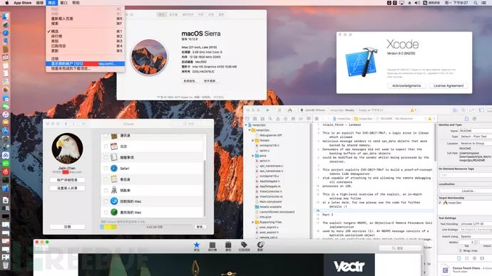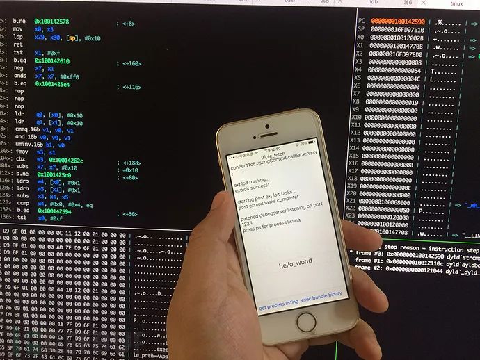 使用刚刚安装的Xcode来编译Ian Beer的iOS 10.3.2用户态过沙盒工具,lldb可以attach任意进程进行调试,并且运行任意自定义的二进制,详细分析可以看keenlab的陈良和阿里的蒸米对漏洞的分析。