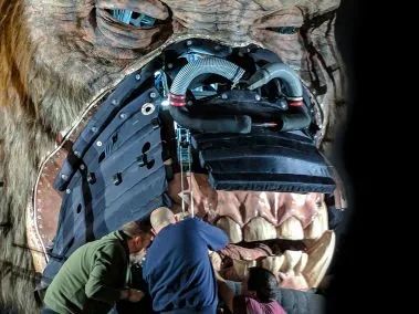 Kong 的眼睛会跟随它面前人们的位置转动,让人觉得 Kong 在注视着自己。当条件合适时,Kong 的鼻孔还会将压缩空气喷射到其访客的脸上。这大概就是怪物电影的沉浸式体验了吧。
