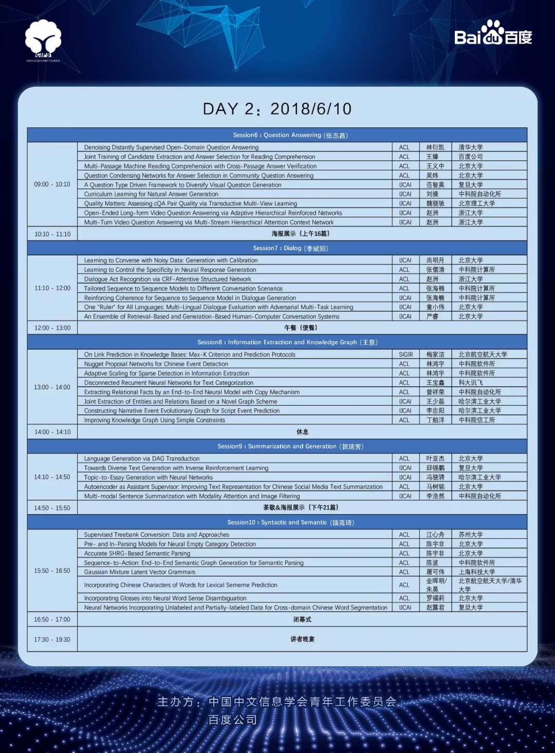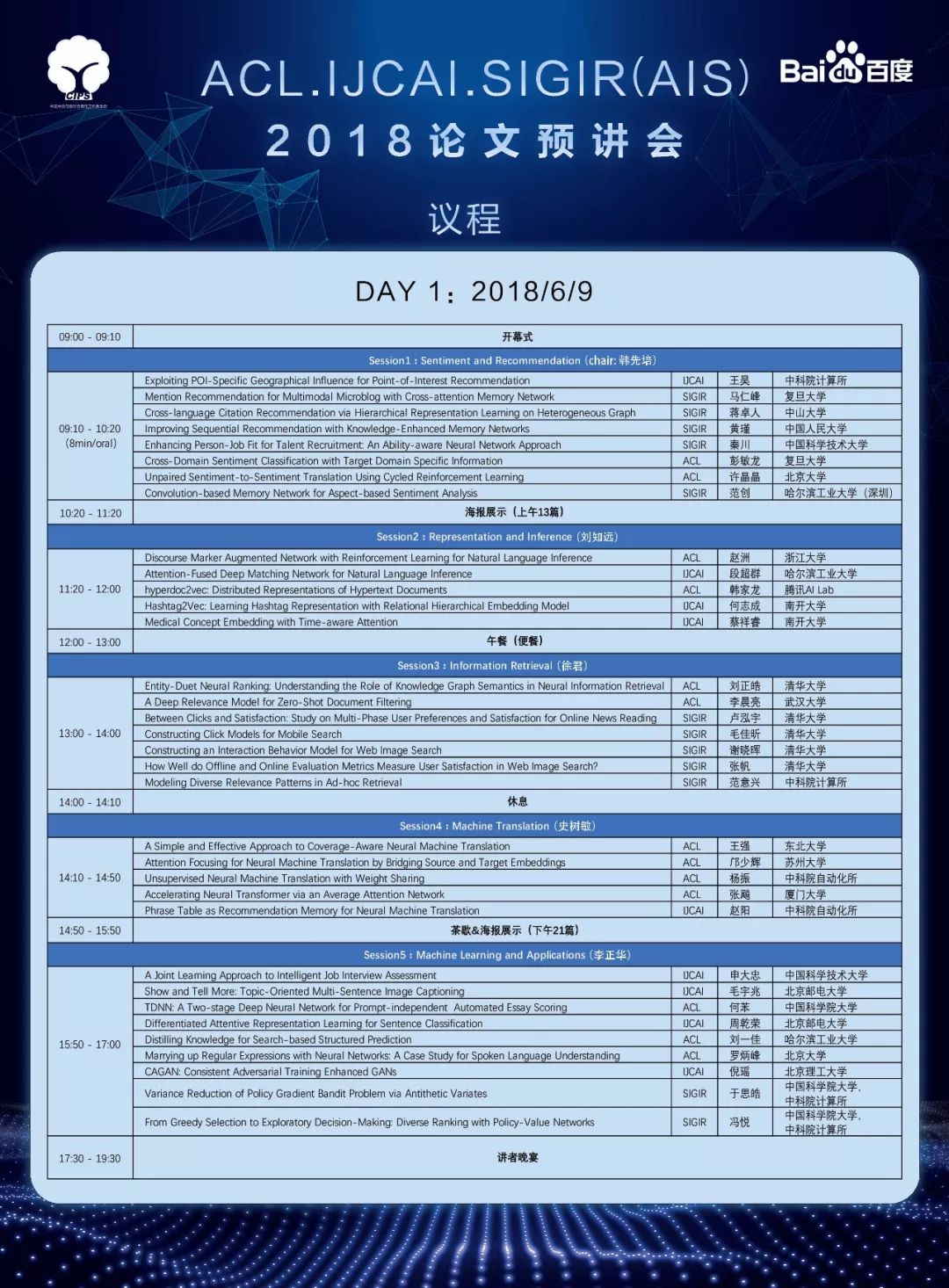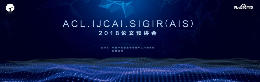 作为自然语言处理和信息检索领域的三大国际旗舰会议,ACL(墨尔本,15-20)、IJCAI(斯德哥尔摩,13-19)、SIGIR(密歇根州安娜堡,8-12)均将于7月举行。为了促进学术交流,在会议召开之前,2018年6月9-10日,中国中文信息学会青年工作委员会联合百度公司,共同举办了AIS2018(ACL、IJCAI、SIGIR)论文预讲会。