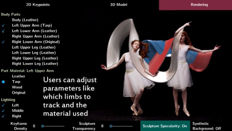 将视频加载到系统后,MoSculp将检测到的关键点覆盖在输入帧上,并通过几个随机选择的帧来验证。(内置的校正工具可以让用户在必要时进行调整。)在对“暂时不一致的检测”进行校正后,它会生成运动雕塑,并将其加载到自定义界面中。