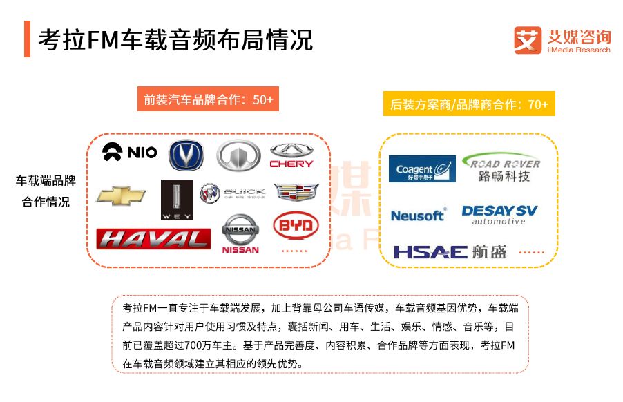 艾媒咨询的数据显示:从车载端的布局情况来看,考拉FM丨听伴已经与50家主机厂达成合作,累计激活车载设备700万+,已经签署独家合作协议的车企未来将覆盖5000万辆智能网联汽车。