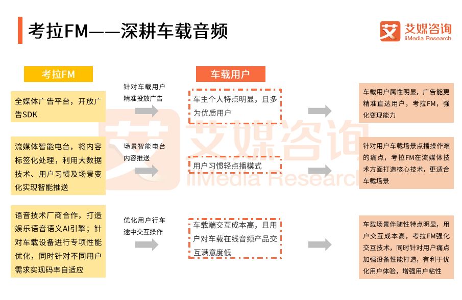 值得注意的是,在与车企的合作中,对于不同的品牌和需求,考拉FM丨听伴采用了针对性的策略。如,提供一站式车载音频娱乐解决方案的K-radio,以场景化+智能电台流的核心技术,整合优质内容,节省车企研发成本和时间、简便预装,更重要的是首次解决了行业中普遍存在的内容版权限制、厂家重复BD和技术对接问题,实现跨平台的内容合作以及内容聚合,同时为各方提供广告分成。而对于定制化比较高的车企,考拉FM丨听伴推出品牌电台产品,为品牌打造专属定制内容,以智能电台流方式呈现,帮助车企经营品牌、经营用户。