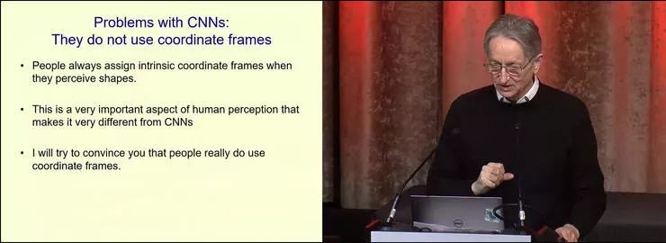 最后一点,也是 CNN 最严重的问题是,CNN 不使用坐标系。当我们人类观察东西的时候,只要看到一个形状,我们就会给它假定一个坐标系。这是人类感知的一个基本特点。我会举例子尝试说服你接受这件事;不过我的时间不是很多,我会试着很快地举例子说服你。