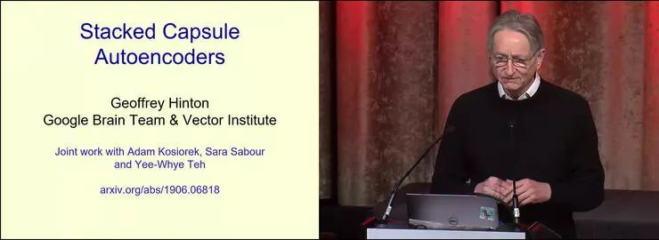 现在我要具体介绍一个系统,它的名字叫做 Stacked Capsule Auto-Encoders。有的人可能已经读过一些胶囊网络相关的东西,这里我得说明,这是另外一种版本的胶囊。每一年我都会设计出一种完全不同的胶囊网络,NeurIPS 2017 的那篇是关于路由的,ICLR 2018 的那篇使用了 EM 算法,然后在 NeurIPS 2019 还有一篇新的,就是我现在要介绍的这个。