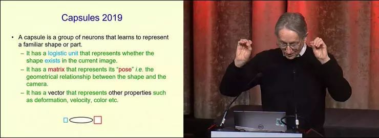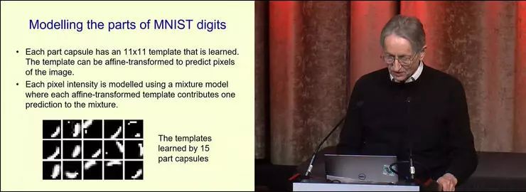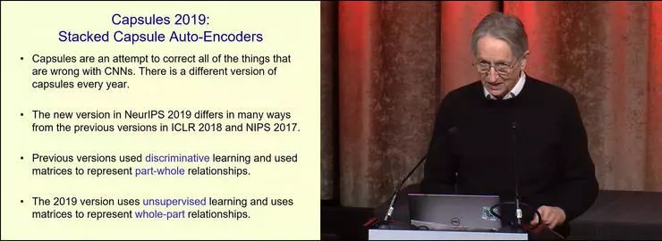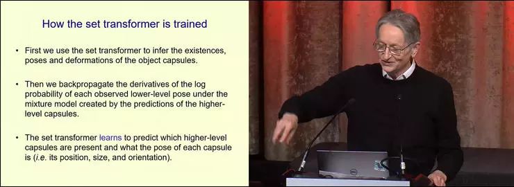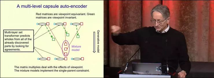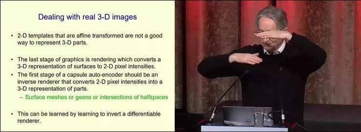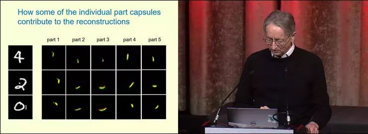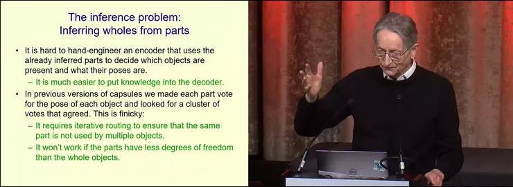 所以,首先要把之前的那些版本的胶囊网络的一切都忘了,它们都是错的,只有现在这个是对的(观众笑)。之前的那些版本用了判别式学习,我当时就知道这个做法不好,我一直就觉得无监督学习才是对的,所以之前的那些版本都走错了方向;而且它们都使用了「部件-整体」关系,效果也不好。用「整体-部件」关系要好很多。用「部件-整体」关系的时候,如果部件的自由度比整体的自由度要少,好比部件是点,然后你要用点组成星座,那你很难从一个点的位置预测整个星座的位置,你需要用到很多点的位置;所以不能从单个部件出发对整体做预测。
