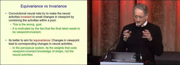 下面我先解释一下 equivalence(等价)和 invariance(不变)。典型的 CNN,尤其是带有池化的网络,它得到的表征是不随着视角的变化而变化的,是「invariance 不变」,和得到「equivalence 等价」的表征是两码事。「equivalence 等价」的意思是说,随着视角变化,表征也跟着变化。我相信的是,在人类的感知系统中,当你的视角变化的时候,神经活动的模式也会跟着变化;我不是说识别得到的标签要变化,显然标签是需要保持不变的,但你的感知活动的表征可能会发生很大的变化。不随着视角变化而变化的,是连接权重,而权重编码了不同的东西之间的关系。这个我待会儿还会说到。