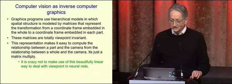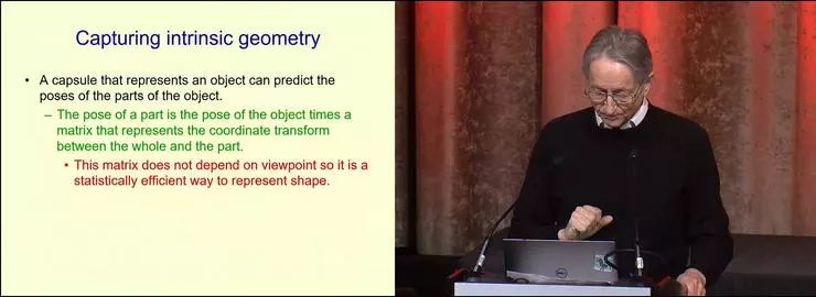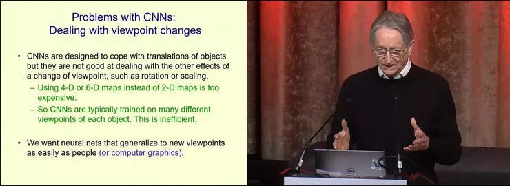 CNN 的设计可以处理平移,但是对其他类型的视角变换处理得很不好,比如对于旋转和缩放 —— 不过比我们一般认为的还是要好一点。一种处理方式是把二维特征 map 换成四维或者六维的,但是计算成本增加得太多了。所以,训练 CNN 的时候要使用各种不同的视角,来让模型学习如何泛化到不同的视角上;这种做法很低效。理想的神经网络应当不需要花什么额外的功夫,可以自然而然地泛化到新的视角上 —— 学会识别某种物体以后,可以把它放大十倍,再旋转 60 度,仍然能够识别,这样才是合适的。我们知道计算机图形学就是这样的,我们也希望能设计出更接近这样的神经网络。