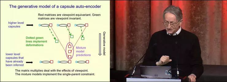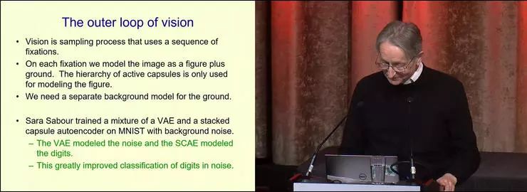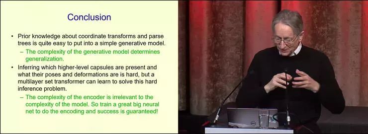 现在我还没展示如何做编码器,也就是感知的部分。这是一个很难的推理问题,在之前版本的胶囊里,我们对编码器做了一些人工工程,要对高层次的胶囊投票、看投票的结果是否一致,这种方式特别难搞,很难做对。Sarah 花了很多时间精力研究这里,她虽然让它运行起来了,但还是非常困难。