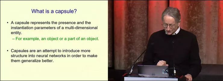 「胶囊」的出发点是,在神经网络中建立更多的结构,然后希望这些新增的结构可以帮助模型更好的泛化。它也受到了 CNN 的启发,在 CNN 里 Yann 只设计了很少、很简单的一些结构,就是让特征检测器可以在不同的平移变换之间复制,这个改进产生了巨大的好处。那么我的下一个问题就是,我们能不能沿着这个方向继续往前走,能不能设计一些更加模块化的结构,这样就可以做解析树之类的。