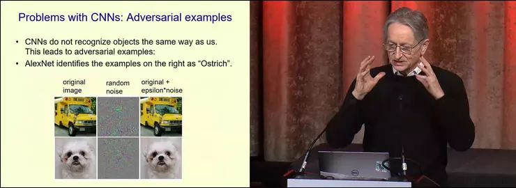 但 CNN 和人类的感知有很大的区别。我今天演讲的第一部分可以算是都在针对 Yann LeCun 了,我要指出 CNN 的问题,告诉你们为什么 CNN 是垃圾。(观众笑)