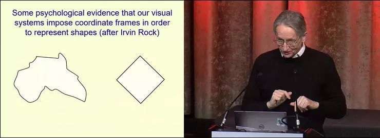 因为没有时间看那些很漂亮的 demo,我们就看看这两个形状。左边这个像是某个国家的地图,有点像澳大利亚;但是如果我告诉你这个形状不是正的,是斜的,它看起来就像非洲。一旦你看出来它像非洲了,它就和一开始感觉的那个仿佛镜像过的澳大利亚完全不一样。但我们不是第一眼就能看出来它像非洲的,如果告诉你它是某个国家,那你就只会把它看作某个国家。