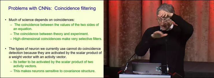 那么,目前我们使用的这种神经元是不会寻找巧合的;不过情况也在变化,我们也开始使用 Transformer 模型,而 Transformer 是会寻找巧合的;等一下我也会解释这个。计算两个活动向量的点积,这要比原来的做法强多了;这就是计算这两个活动向量是否匹配,如果是,那就激活。Transformer 就是这么工作的,这带来了更好的过滤器。这也带来了对协方差结构和图像有更好响应的模型。这里真正重要的就是协方差结构,像素的协方差结构。