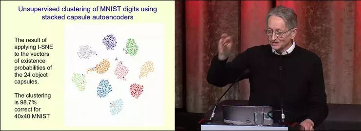 接下来我要展示的是,在学会了如何提取部件之后,要学习整体,来解释这些部件的组合。然后把那 24 个高层次胶囊的激活模式组成的向量拿出来,用 t-SNE 作图,也就是把这些高维向量嵌入到二维空间,两个向量越相似,他们的距离就越小。在看图之前我要说明,这些胶囊从来没有学习过标签,完全是无监督学习得到的,然后得到的结果是: