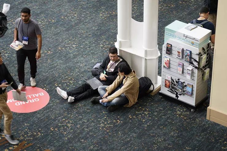 发邮件提醒提前签到其实只能算是最后时刻的小手段,实际上最重要的是订足够大的会议场馆。为了能容纳这么多参会者、有足够空间安排会议议程,组委会订下的会议场馆实际上由三栋建筑组成:长滩会议中心(Long Beach Convention & Entertainment Center)有两个大会议厅、数个小会议厅,还有巨大的展区供企业布展;长滩表演艺术中心(Long Beach Performing Arts Center)有一个大表演厅和多个小会议厅;长滩竞技场(Long Beach Arena, Pacific Ballroom)更是一个可以容纳数千人的体育馆。这还不够,紧邻的 Hyatt 酒店还被征用了数个会议厅供前两天的议程使用。