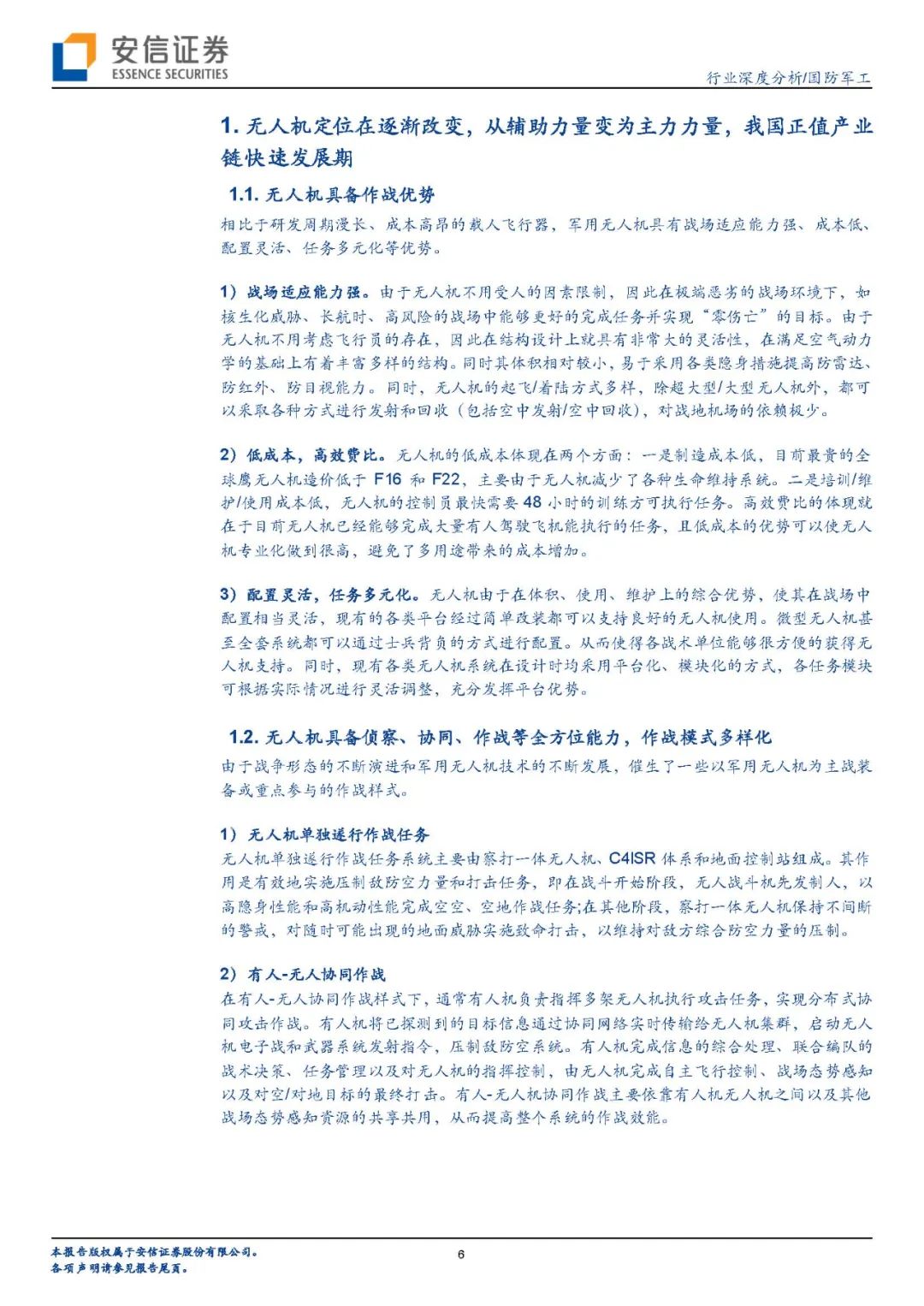 无人机定位在逐渐改变,从辅助力量变为主力力量:相比于研发周期漫长、成本高昂的载人飞行器,军用无人机具有战场适应能力强、成本低、配置灵活、任务多元化等优势。由于战争形态的不断演进和军用无人机技术的不断发展,催生了一些以军用无人机为主战装备或重点参与的作战样式。由于无人机的技术的升级与作战模式的不断多元化,战争中的应用增多,依赖性增强,逐渐从辅助力量变为主力力量。