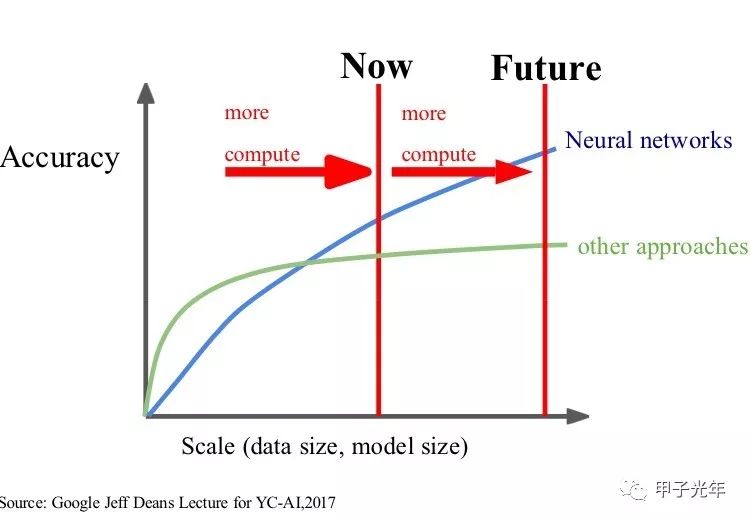 其次,在现有的主流“有监督学习”的算法模型下,为了让算法有更高的准确率,数据不嫌多。Google的技术大牛Jeff Dean曾在一次公开课上展示一个海量数据的训练结果,如下图所示:横轴代表数据规模,纵轴代表准确率,蓝线是深度神经网络算法,绿线是传统训练方法。