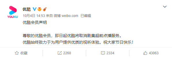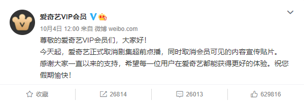 10 月 4 日,爱奇艺 、腾讯视频 、优酷视频三大视频平台官宣取消剧集超前点播服务,并停止超前点播内容更新。此前已有不少网友对于视频平台 VIP 会员服务和超前点播机制表示不满,9 月中消协还发文呼吁少些套路,多些真诚,视频平台 VIP 服务应依法合规、质价相符