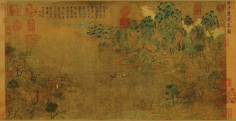 但这还不是我们经常所说的“山水”。我们知道“山水”这个东西,作为独立的关照对象,是从六朝刘宋时期的谢灵运写山水诗开始的。那个时期,豪门贵族中的一些人开始关心山水,中国的山水诗就这样起来了。当然还有田园诗,就是陶渊明的写作,也在那时展开。山水成为独立的绘画主题的时间要稍微晚一点儿,流传到今天的所谓中国的第一幅山水画是隋代展子虔画的《游春图》。到了唐朝,大量的山水诗歌出现了——这一定是在国泰民安的时候,大家坐下来不用操心别的事儿,才可以面对山水。