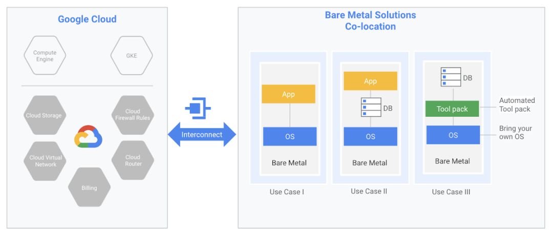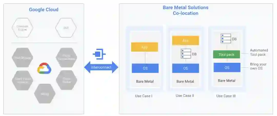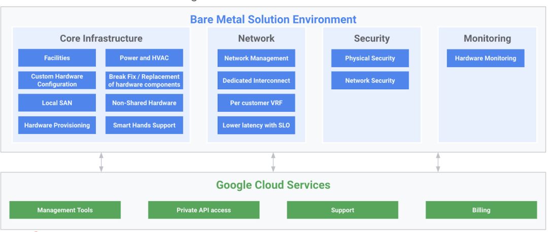 裸金属解决方案包含运行特定工作负载所需的全部基础设施,例如与 Google Cloud 联系紧密的 Oracle 数据库。基础设施会通过专用的、低延迟、高可用的进行互连,并且可连接至所有原生 Google Cloud 服务。裸金属解决方案采用经多个企业级应用认证的OEM硬件来运行,其中几乎大部分应用无需修改即可迁移到此基础设施内,减小迁移风险的同时显著提高了迁移速度。