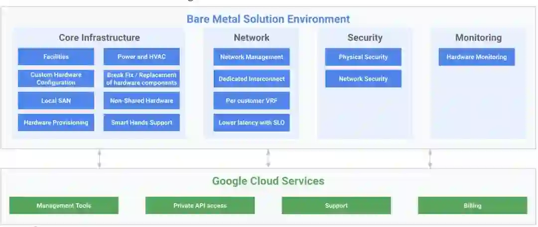 作为 Google Cloud 的组成部分,裸金属解决方案可将配置、管理和监控基础架构的工作交由 Google,从而为您减轻负担,让您专注于自己的数据中心现代化工作。