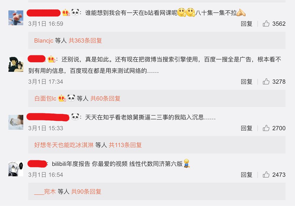在那条引发了诸多讨论的微博下,有人留言说自己会在 B 学习做饭,看科普视频,甚至有人在期末考试期间,看完了三十多集的《法律逻辑学》。