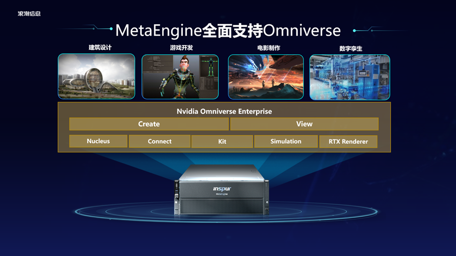 当前,元宇宙服务器MetaEngine全面支持英伟达的Omniverse企业版,这样将高性能GPU图像计算、AI计算、高速存储访问、低延时网络、精确计时结合,构成数据中心级的软硬件一体解决方案。