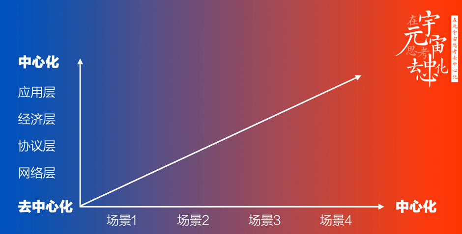因此,肖风认为,要全面看待去中心化,要去其糟粕,取其精华,为我所用。建议用的方法如下面的坐标图:在横轴上,不同的应用场景中做好中心化或者去中心化的「区间匹配」,大部分的应用场景都应该是坐落在这两个坐标点的某一个位置;在纵轴上,做好不同网络层次中心化或者去中心化的「分层分级」,网络层可能更去中心化一些,而应用层可能更偏中心化一些。