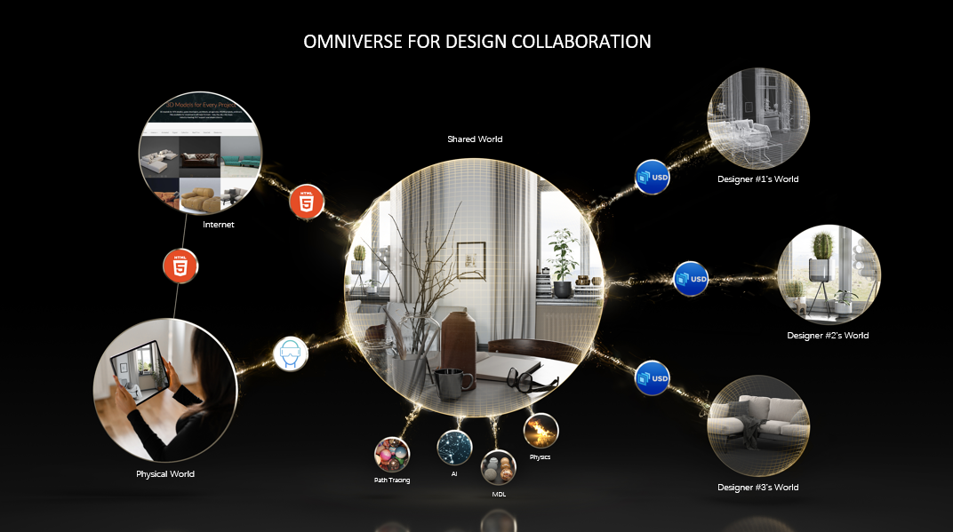 在人和工具的共同协作问题上,Omniverse上已经基本解决。不管是纽约、东京、巴黎的设计师和工程师,都可以通过Omniverse支持的软件加上AI,跟实体世界实现直观的连接。