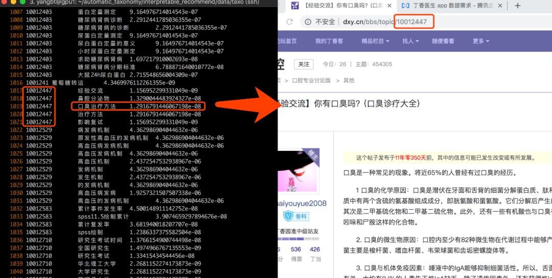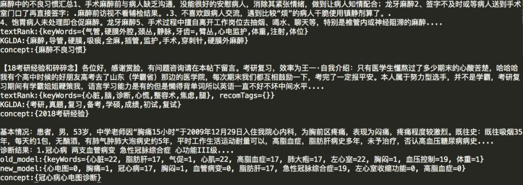 在丁香园论坛帖子的文本数据上,我们应用了前文调研的主题抽取、实体显著性判断、短语挖掘、concept召回等方法,所获得的标签在主题贴近度和可解释性上都有显著提高: