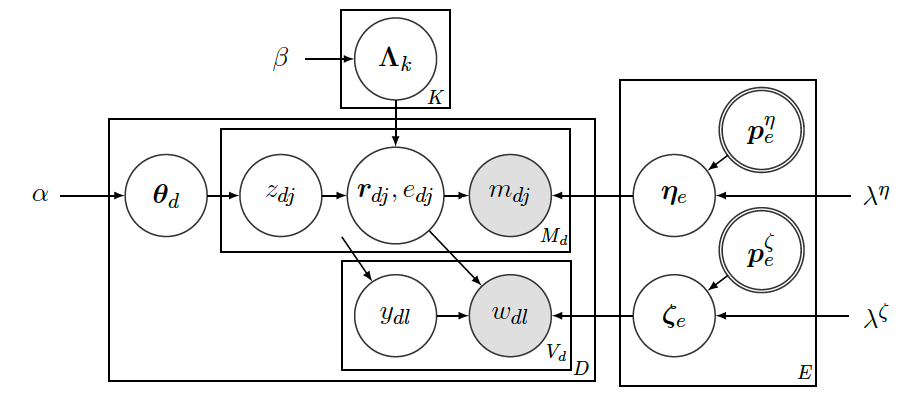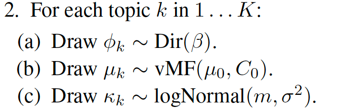 由于一些知识表示(TransE)是unit sphere,因此使用von Mises Fisher(VMF)分布对其进行建模。vmf分布被广泛用于模拟此类定向数据。此外,使用vmf分布代替多元高斯分布,可以更有效地进行推断。与传统LDA模型相比,增加一组参数:(μk, κk) ,主题k的vMF分布;以及edm,即文档中实体的知识表示向量。