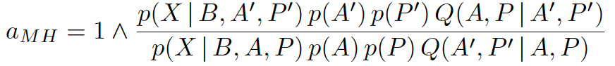 推导了一个B、B-、A、A-和P(以及添加和删除主题)的 blocked-Gibbs sampler。然而,单是吉布斯抽样并不能使主题概念词矩阵中的稀疏性足够快。混合速度很慢,因为阻塞的吉布斯取样器设置Akw~=0的唯一时间是没有w~计数分配给任何文档中的主题K时。当有海量文档时,不太可能达到零计数,采样器稀疏主题概念词矩阵A的速度会很慢。因此本文引入了一个MH procedure,通过在A和P上的 joint moves,鼓励主题概念词矩阵A向更大稀疏的方向移动。分布如下: