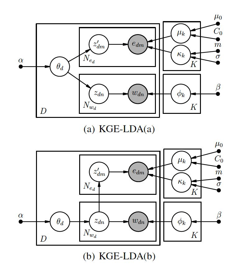 概率主题模型可用于从文档集合中提取低维主题。然而,以往的模型往往产生无法解释的主题。近年来,已有许多基于知识的主题模型被提出,但它们不能很好的处理知识图中的三元组,大部分以must-link形式,或直接利用图谱中的上层概念,无法在向量空间中量化。本文将知识表示嵌入到到LDA中,将潜在的Dirichlet分配(一种广泛使用的主题模型)与实体向量编码的知识相结合,来提高了主题语义的一致性和连贯性。本文主要在两个以往研究(CI-LDA和Corr-LDA)上做了改进,上图为linkKGLDA,下图为corrKGLDA: