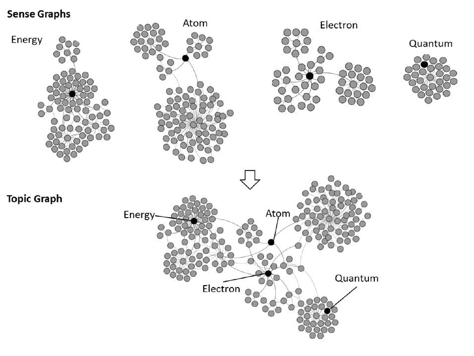 在模型中,主题被一些潜在的概念词概括,这些潜在概念词来自观察词在本体中的图。