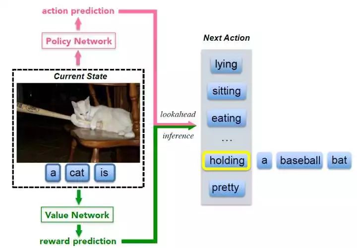 value network 扮演一个全局、前瞻的 guidance,评估现状态所有可能的扩展状态。该网络本质上是在调整学习的方向,从预测正确的词汇到描述与 ground truth 相似的描述(这句话我不是很理解)。