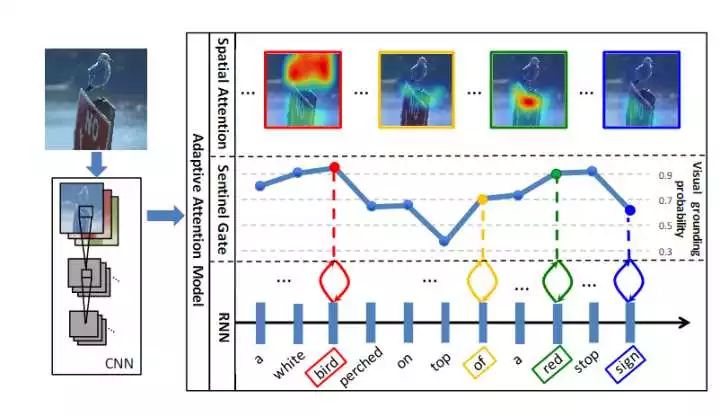 这篇文章提出的是基于 visual sentinel(哨兵)的 adaptive attention 模型,在生成每个单词时,模型决定是 attend to 图片还是视觉哨兵,当语言模型不能提供有效信息的时候,模型才 attend to 图片。