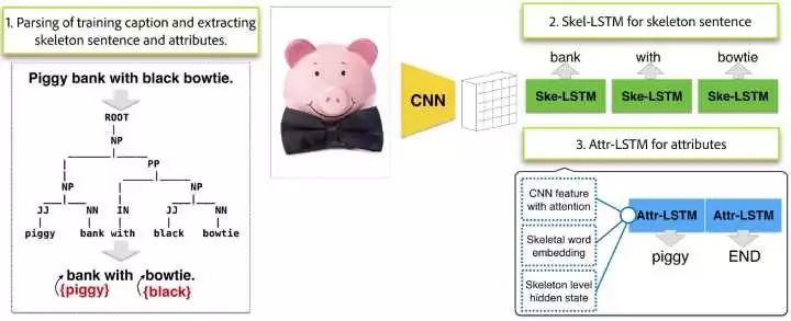 文章提出了一种 coarse-to-fine(我将其理解为椎轮大辂)的方法,将原始的图片描述分解为两个部分,一个主干句(skeleton sentence)和各种物体的特征(attributes),再生成语句的时候,也分为两个部分进行生成。通过这种分解,该文章的模型达到了 state-of-the-art 的效果。