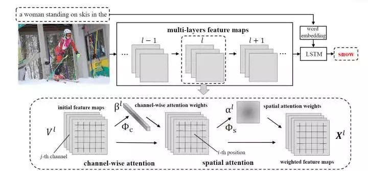 具体来说,这是一种 spatial and channel-wise 的 attention 机制,这种 attention 机制学习的是多层 3D-feature map 中的每一个 feature 与 hidden state 之间的联系,也就是在 CNN 中引入 attention,而不是单单使用 CNN 部分的输出。