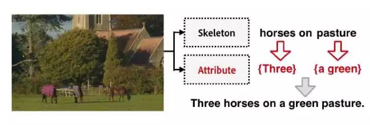 为了生成上图中的描述,首先生成一句 skeleton sentence: horse on pasture(马儿在牧场上),用来表示物体中的主要物体和物体之间的关系,horses on pasture;然后,这些通过 visual attention 重新访问这些物体,当物体的 attention response 很大时,就生成对这些物体特征的描述,Three 和 a green。将两个句子结合起来生成最终的描述,Three horses on a green pasture。