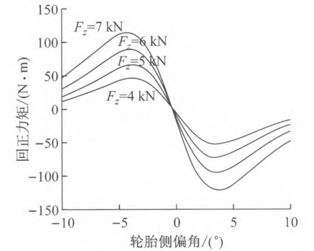 从图 2 中可以看出,在不同垂向载荷 F_z 下车辆的回正力矩随轮胎侧偏角变化的关系。