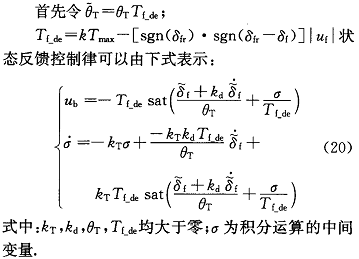 (2)基于回正力矩的非线性特性和系统参数不确定性,设计了前馈加状态反馈的控制律。基于一种条件积分方法,防止由于状态反馈引人了积分运算,在执行器力矩受限的情况下,导致积分饱和引起的性能恶化,保证转向轮转角跟踪的稳定性。
