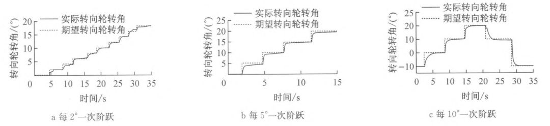 由于试验场地原因,车速在 20 km/h 左右。试验中期望转向轮转角为每 2° 一次阶跃直到 20°,见图 8a;每 5° 一次阶跃直到 20°,见图 8b;每 10° 一次阶跃直到 20°,见图 8c。