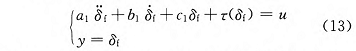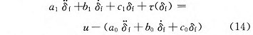 式中:τ(δ_f ) = -M(δ_f );u 表示系统的控制输入,u = kT;y 表示系统的受控输出;系统参数 a_1 = J_eq,b_1 = B_eq,c_1 = C_eq。
