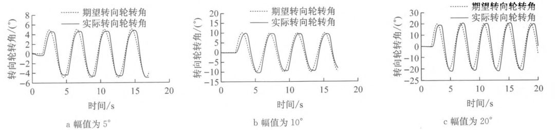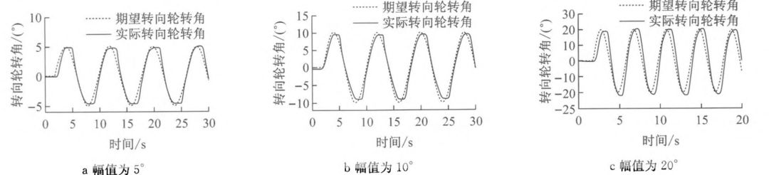 由于试验场地原因,车速在 20 km/h 左右。试验中期望转向轮转角周期为 4 s(见图 9),幅值分别为 5°(见图 9a),10°(见图 9b),20°(见图 9c)的正弦信号;期望转向轮转角周期为 8 s(见图 10),幅值分别为 5°(见图 10a),10°(见图 10b),20°(见图 10c)的正弦信号。