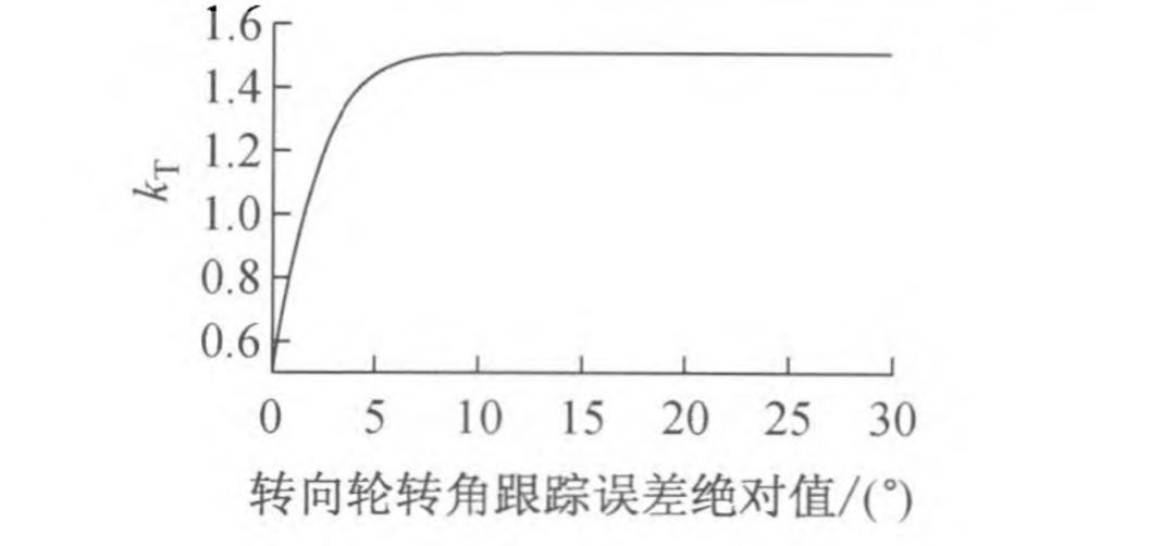 为防止有过大的超调量出现,根据转向轮转角跟踪误差的绝对值来改变是 T 的取值,是 T 的取值随跟踪误差的绝对值增大而增大直到 1.5 为止,如图 6 所示。