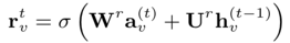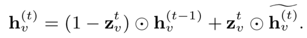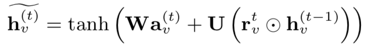 节点的state embedding h_{v^(t-1)},与其他节点的交互信息a_{v^(t)}通过GRU单元进行融合: