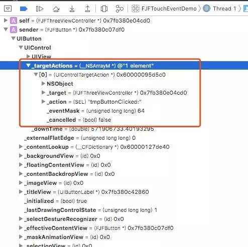 实际上,我们在程序某个合适的位置打个断点来观察UIControl的内部结构,可以看到这样的结果: