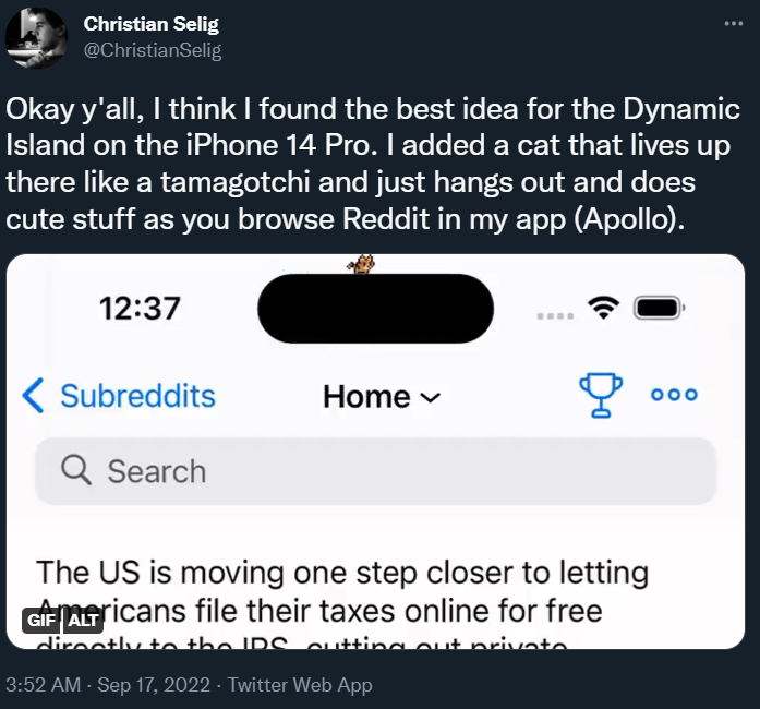 本着「买都买了」的心态,不少网友已经开发了一些灵动岛的新玩法,比如在上面养一只可以来回跑动的小猫。