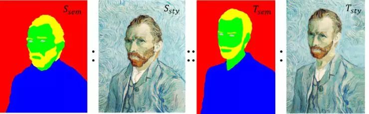 图 1:问题描述。输入素材语义图 S_sem、素材风格图 S_sty 及目标语义图 T_sem,能够自动生成具有目标语义和素材风格的目标风格图 T_sty。